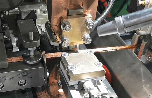 概要信息:我們根據(jù)產(chǎn)品形狀及要求,建議采用一臺MD-40中頻逆變焊接電源,人工裝卷料至上料架,再將銅線裝入定位模具焊接,由自動給放料裝置配合,焊接由上下電極、左右夾緊定位機構(gòu)完成,然后由伺服機械手,將工件拉伸進入剪切位置剪切,剪切長度在一定的范圍內(nèi)可調(diào)。